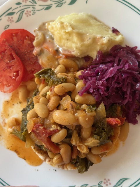 White kidney beans sauteed with sun-dried tomato, kale and on the side sauteed red cabbage and mashed!